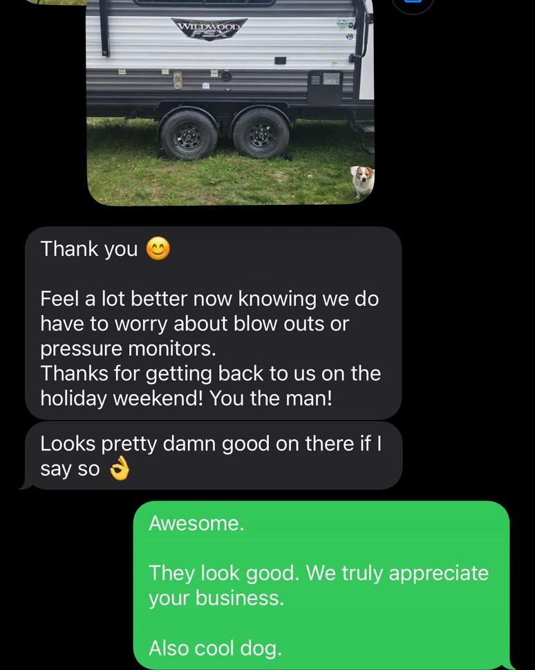 RV-DE-FENDER® highly recommends checking the conditions of all tires on your vehicle and RV in tow prior to any road trip. We also recommend the use of quality TPMS for added protection.